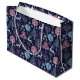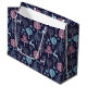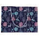 A modern abstract pattern with white deer leaping and prancing against a night blue background filled with turquoise blue and purple trees.