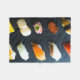 This cozy fleece blanket features a beautifully curated selection of nigiri sushi—each delicately arranged on a matte black slate plate. From salmon and scallop to tamago and ikura, the vibrant textures of the sushi stand out with vivid contrast against the dark background, bringing a sophisticated sushi bar ambiance to your space.