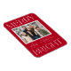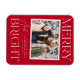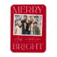 Modern fotomagnet i helgdag med vågräts fotokant i ett vitt snabbfoto ram. Uttrycket "Merry and Bright" visas med vit text med en festive red bakgrund. Anpassa fotojulsalen med anpassningsbarna hälsning, familjen namn och året.
