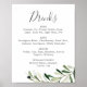 Denna moderna olivgrensbröllopsdryckers meny skylt är perfekt för ett boho-bröllop. Den rustika men ändå eleganta designen har enkla vattenfärg botaniska gröna blad och svarta oliver på en liten gren med en klassisk medelhavskänsla.
