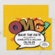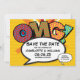 En popup-inspirerad roligt, coola och trendig för tecknad bok sparar datuminbjudan som lägger gryningen, locket, pow i ditt meddelande om bröllop-datum. Den omvända har en matchande bok-polka-punkt mönster som du kan ersätta med en egen bild eller ett eget foto. Designad av Thisisnotme©