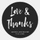 De här nya och moderna bröllopsmärken har trendig handskrivet vitt skript som säger "kärlek och tack" på en rik, svart bakgrund.