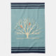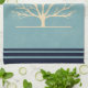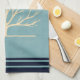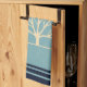 En kökshandduk med en muterad grönt bakgrund som läggs ovanpå är en lätt gult träd med 2 orangar fågelsilhuetter sitta på grenar.