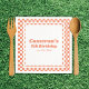 Moderna barns gender-neutralt-picknick party födelserokor med en orange-check mönster. Anpassa den med barnens namn, ålder och alla detaljer du vill inkludera. Matchande produkter är tillgängliga.