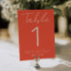 Modern and elegant whimsical bright orange and cream wedding table numbers. As you see it features a bold fun orange background with cream script that matched the whole suite.