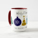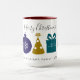 Celebrate holiday season with this Merry Christmas mug design featuring ornament snowflake, pine tree and surprise gift . Best option for customised gift. Personalise this mug by adding your family signature and year.