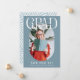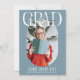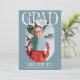 Meddela din goda nyhet med detta stilrena moderna examensmeddelande. Designen har en dammig teal bakgrund som kan ändras till valfri färg, stilren GRAD-text, examen namnet i signaturstil överst, ett ovalt foto, ett anpassat meddelande, examen, studieort och årskurs.