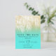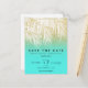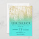 Modern enkel vit tropisk palmträd med enkel typografi, ett trendigt och tropiskt tema för att spara datum för bröllop med falskt guld glitter tropiskt på palmträd blad på akva teal hav.