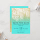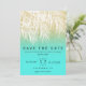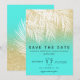 Modern enkel vit tropisk palmträd med enkel typografi, ett trendigt och tropiskt bröllop spara datum tema med falskt guld glitter tropiskt på palmträd blad på aqua teal hav.