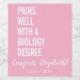 Skål för dig, biologisk examen! Vi firar din anmärkningsvärda prestation med en speciell flaska vin med en personlig, rolig etikett. Designen visar en rosafärgad bakgrund med fet vit text som lyder "Passar bra med en examen i biologi". Nedan är "Grattis, [namn]!" elegant skrivet i kalligrafi och "Klass 2024" visas i snygga, vita blockbokstäver längst ner. Denna anpassningsbara etikett låter dig skräddarsy designen för att passa tillfället perfekt. Fira deras enastående framgång med denna unika och minnesvärda vinetikett!