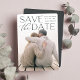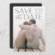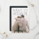 Anteckna att du i bröllop har ett oförglömligt stil med den här eleganten och ett modernt foto sparar datumkorten med ett lodrät eller ett foto med utfall i fullt med "spara datumet" som läggs över i rik med svart text överst. Din placering i namn, bröllop och bröllop visas vid sidan av den moderna texten. Anpassa baksidan med ytterligare information, t.ex. webbplatsen bröllop.