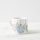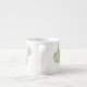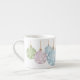 Kopp har tre icke-traditionella julprydnader i färg i pastellernas grönt, rosa och blått med vita stjärnor. Utsmyckningarna i olika storlekar omger mugg över en vit bakgrund.