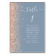 Det moderna kortet för bordsnummer i bröllop som är lämnat kant i eleganten har en persikofaux gräns. Ord "bord" visas i ett vitt handskript med vismisk skrift på en dammig blå bakgrund. Lägg till namnen för de gäster som tilldelats varje bord.