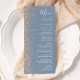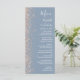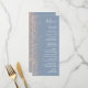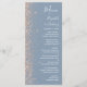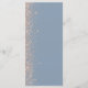 Den moderna bröllop-menyn på den lämnat kant i eleganten har en design för persikofaux glitter. Anpassadet kombinerar vit handskrift, tryckplåt och kursivt typsnitt på en dammig blå bakgrund. Baksidan har en dammig blå och persikofärgad utformning av glitter.
