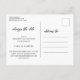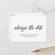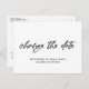 Modern vykort för uppskjutningsmeddelande i Bröllop med ord som enkel utformning, "ändra datumet" i ett handskriftsteckensnitt för svarta penselskript över en vit bakgrund. Baksidan har ditt personliga meddelande och din returadress för enkel utskick. En minimalistisk elegant för att meddela att bröllop har skjutits upp.