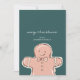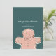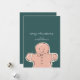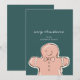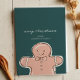 Den här julkortet har en minimalistisk design med ett lekfullt och glatt tema. Den centrala illustrationen är en pepparkaksgubbe i en ljust brun färg, konturerad med mjuka svarta linjer och dekorerad med vita glasyrdetaljer, inklusive knappar, en fluga och mönster på armarna. Bakgrunden är i färgen Metal Green, vilket skapar ett enkelt och elegant utseende. Designen fokuserar på festlig charm samtidigt som den bibehåller en modern, oskomplicerad estetik.