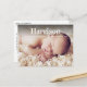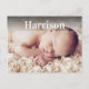 enkelt dina lycklig-nyheter med detta djärva födelseanslagskort. Postkortets framsida innehåller ett stort foto av det nyfödda barnet. Ett vitt textöverlägg överst på designen inkluderar ditt nyfödd bebis namn skrivet med fet stil. Nedan kan du lägga till ditt baby fullt namn och födelsedatum. Den här designen fungerar bäst med foton som har en mörkare bakgrund så att den vita texten kan skina verkligen. På baksidan av vykortet hittar du utrymme för skriva och ett längre anpassningsbar-meddelande till mottagarna.