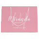 Personlig Bridesmaids Gift Bag med personlig Bridesmaid's namn i vitt, modernt typsnitt stil och monogram i lätt rosa, modernt typsnitt stil som bakgrund med titel och bröllop datum i vitt modernt sans serif-typsnitt stil på rosa. Även perfekt för maid of honor, blomsterflicka, budens mamma med mera.