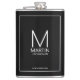Lägg till en personlig beröring till bröllop med marskalkarna personlig. Den här kolven har personlig Groomsmans monogram och namn med rubrik och bröllop datum i vitt, modernt sans serif-teckensnitt stil på svart bakgrund. Perfekt för den bäste mannen, far av bruden och mycket mer.