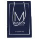 Lägg till en personlig beröring till bröllop med personlig marskalkars presentväska. Den här presentsäcken har personlig Groomsmans monogram och namn med titel och bröllop-datum i vitt, modernt sans serif-teckensnitt stil på marin blå bakgrund. Perfekt för den bäste mannen, far av bruden och mycket mer.