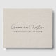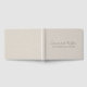 En modern minimalistisk bröllopsgästbok med handskriven stiltypsnitt på en falsk linne silvergrå bakgrund.