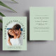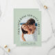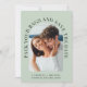 Modern grönt-målbröllop med ljussken sparar datumkortet som innehåller ditt foto i ett bågat ram, "Pack Your Bags and Save the Date" i elegant och ditt första namn, datum och plats för bröllop. På motsatt sida anpassar du datuminformationen i enkel typografi.
