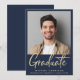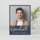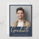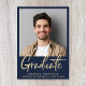 Modern blått studenten-meddelande med gradens foto, "Student" i ett fet contemporary ljust guld-skript och deras namn, klassår och skola i lätt guld typografi.