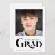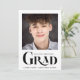 Meddela din student framgång för familj och vänner med det här moderna studenten-meddelandet som innehåller hans eller hennes favoritfoto, "GRAD" skrivet i fetstil med trendig. Lägg enkelt till hans eller hennes namn, skolår och klassår.