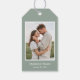 De vackra märkrna i Modern Photo Bröllop med en eukalyptus grönt gräns är perfekt för att binda på favörerna vid din förlovningsfest, par dusch, repetitionsmiddag eller bröllopsmottagning. Välj ett foto som du gillar som återspeglar kärlek för varandra. Anpassa dem med foton, namn och datum. De kommer att se fantastiska ut på dina gäster!