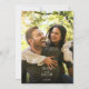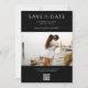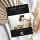 De här moderna bröllop spara datum-korten har elegant minimalistisk typografi i vit färg på svart bakgrund bredvid ditt eget personlig-foto.