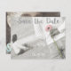 Modern Whimsical Script Photo Save the Date with your Photos front and back with tillvalsbeläggning linen overlay på båda sidor.