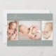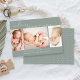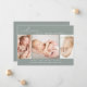 Det här enkla moderna fotokollage-födelseannonskortet är perfekt för att dela med sig av de bra nyheterna om baby. Den har en fotokollage med tre foton på en dammig grönt bakgrund. Lägg till din baby namn och födelsestatus för att anpassa kortet.