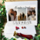 Modern, minimal fotokollage med Bröllop spara datum-kort. Utformningen innehåller 3 foton, namnen i handskriven text i trendiget, datum och plats för bröllop på framsidan och trendiget på baksidan.