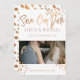 Elegant trendig guld-handskript för kalligrafi Spara Vårt Date bröllop-kort i enkelt modernt stil med ditt foto och tre linjer anpassningsbar text över en vit bakgrund. Anpassa den med en bild som är orienterad mot liggande/vågrät, namn, händelsens datum och ställe och med webbplatsen för mer information. ++++++++++++ Observera att bakgrunden till färg är redigerbar. Du kan ändra den på båda sidor efter att ha valt alternativet ANPASSA IT.