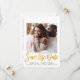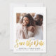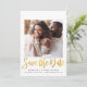 Minimalt aktuellt bröllop spara datum-annonskort med två av dina foton (1 på framsidan, 1 på baksidan), "Spara datum" skrivet i ett guld-faux-folie för snyggt och bröllop-datum, plats och webbplatsinformation i enkel typografi.