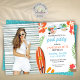 Modern Photo Retro Tropical Bassäng Party Birthday Bjud med hibiscus, solglasögon, flinflip flops och en surfboard gör detta till perfektens inbjudan till alla luau- eller tropiska bassäng-inbjudningar. Anpassa texten för alla händelser!