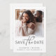 Ren och enkel spara datum meddelande-kort med ett invändigt ram-utklippt och minimalt modernt typografi med ett tryck av elegant. Anpassa med ditt första namn, bröllop-datum och plats. På motsatt sida anpassar du din information om datum och lägger till namnen i ett namnteckning skript.