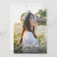 Det här trendiget innehåller inbjudan till elegantens studentfest ett jordnära, strålande foto av student, med trendigets moderna, vita manus tillsammans med klassåret namn, skola och examen. På inbjudningens baksida finns all information och plats i party. Byt ut exempelfotot mot ett eget graderingsfoto.