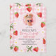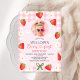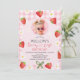 Girls berry first birthday invitation template for girl featuring various strawberries, white daisies and green bow on a pink gingham pattern background and pink arch. This berry first birthday invitation features a photo on the front and is ideal for a girls strawberry themed first birthday party.