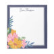 Beautiful floral notepad with a striking floral arrangement hand-drawn on a tablet in pink and yellow with greenery in green and blue. The cluster of flowers sits in the bottom corner of the personalized notepad, leaving plenty of room to write down notes, reminders, to do lists and more. Personalize with your name at the top in a navy blue script.