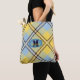 Elegant, snygg och trendig anpassningsbar väska med "personligt namn & monogram" på en jeansmärke och gul / blå plaid tartan bakgrund.