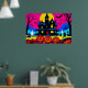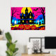 Step into a Halloween that refuses to be quiet! This artwork takes the classic haunted graveyard scene and blasts it with the electrifying energy of a vintage comic book. A bold, gothic manor stands silhouetted against a hot pink sky, while a classic halftone moon beams down on a world of electric blue and vibrant purple. Friendly ghosts and grinning jack-o'-lanterns pop in brilliant, saturated color, creating a scene that's more festive than fearful. What makes this piece truly special is its perfect fusion of spooky subject matter with the fun, graphic style of 1960s Pop Art. It’s the ultimate statement piece for a high-energy Halloween party or for the modern decorator who believes the holiday should be celebrated with bold, unapologetic style. This isn't just wall art; it's a celebration of Halloween at its most fun and fearless.