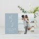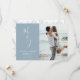 Meddela din bröllopsdag med fantastisk-fotot mot pulverblått bakgrund tillsammans med initialer i ett visemiskt, modernt kalligrafiskript på kortets framsida och mjukt botaniskt löv på kortets baksida. Spara idealiskt datum för bröllop, förlovningar, årsdagar och andra speciella evenemang.