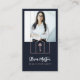 Ett modernt, unikt, professionell äkta gods-affärskort med en bildplatshållare som återspeglar din personlighet och gör ett underbart första intryck. Utformningen innehåller ditt namn med fet handskriven text, logotyp och titel i blockbokstäver på en marin bakgrund. Anpassa ytterligare med kontaktuppgifter, qr-kod och social-media på baksidan.