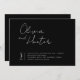 Denna moderna bröllopsinbjudan har en tidlös svart bakgrund och elegant modern text. Det första namn är ett handskrivet blomskript och det andra namn är ett starkt serif-teckensnitt, ge den här inbjudan till perfekten mellan mankulin och feminin. På baksidan finns ett alternativ för använda av ett foto. Lägg till i en QR-kod och anvisningar för online av osa för att göra detta till en modern bröllopsinbjudan.