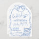 Anpassa denna söta, moderna och snabba blåa och vita stil-inbjudningskort för möhippan-form i hand plockade, bröllop, med handskrivna skrivna skrivstipografidetaljer med detaljer om vit Fransk i coquette med blått band i ram och blommigt med pulverkaka i vintage! OSA på bröllop webbplats- eller skanningsregistrets QR-kodinformation finns på baksidan för en enkel, allt-i-ett-design! Ladda enkelt upp QR-koden för bröllop och redigera den här inbjudan med information om bröllop för att göra den till din! Rulla nedan om du vill se den matchande bröllop-lagersamlingen. Anpassad design-förfrågningar och mallfrågor välkomnas alltid - klicka på "meddelande" eller e-post direkt på: contact@figandlilyco.com Design ♥ Fig and Lily Studios - skicka välsignelser och tack!