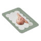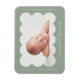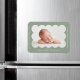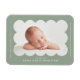 Modern födelsemagnet med ditt barns foto infattat i en vågformad ram i sagegrön färg. Personliggör den sagegröna födelseannonsen genom att lägga till ditt barns namn och ytterligare information i vit text.