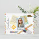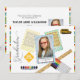 Lägg till stil och en modern touch till ditt barns examen med denna fotoramlayout med skolsaker i bakgrunden. Texten "Graduation" till vänster och föremålen är en skolbuss, skolvägmärke, en linjal, färgglada markörer och en akrylfärgspalett. Tre prickiga ramar (gul, grön och blå) med den översta som en fotomall. Lägg till namn och examensår under fotot. Unika ränder längst upp och ned på vit bakgrund på fram- och baksidan. Textmallar ingår.