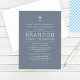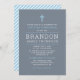 Den här snyggtens första heliga-inbjudan till en pojke och lunch-inbjudan till firande innehåller en modern anpassningsbar för din speciella händelse accentuerad av himlar blå kor och skifferblå/grått-bakgrund färg. En samordnande himlar blå och vit diagonal rand mönster ligger längst bak på kortet.