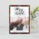 Modern Red Black Tartan Play Roligt Script Simple Helgdag Card. Skicka helgdag varmt önskemål och hälsning till dina kära med det här enkla, minimalistiska, söta och vackra fotokortet med helgdag "Merry and Bright" i snyggtens typografi. Återvänd för att visa en vacker röd och grönt fyr- och tartanbakgrund i mönster. Önska er alla God jul och Gott nytt år!